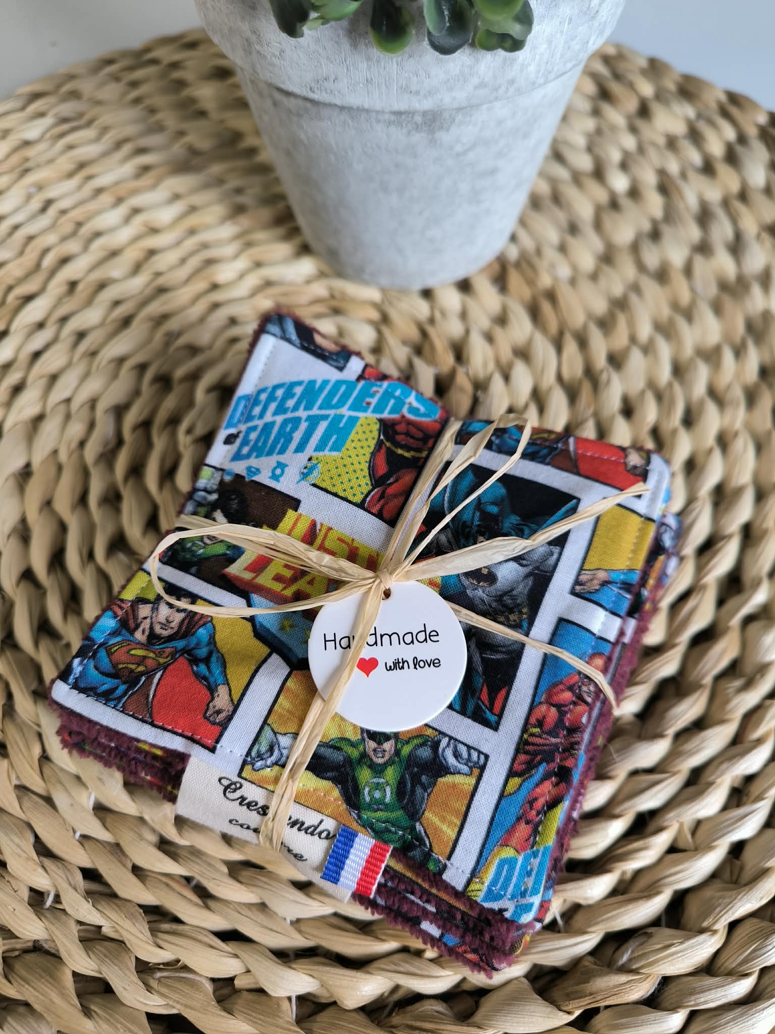 Chaque coton possède une face en tissu imprimé Avengers mettant en scène les héros emblématiques, et une face en éponge bambou doudou couleur lie-de-vin, à la fois douce, absorbante et respectueuse des peaux sensibles.